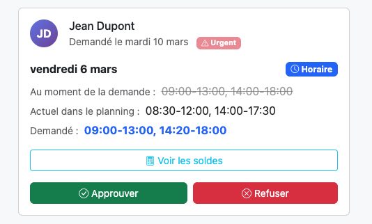 - Les salariés font leurs demandes directement dans l'application. Le responsable valide en un clic. Fini la ressaisie papier.